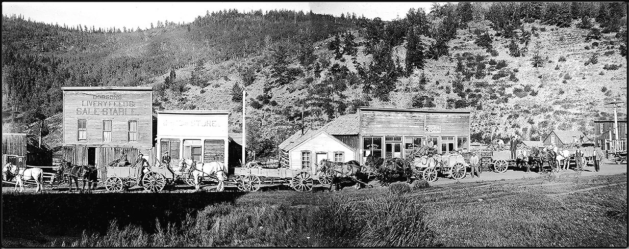 8. Wagons Hauling Freight to and from the mines in Telluride, Colorado, 1909. Art’s Uncle George Schriver developed a profitable business in hauling freight to and from the mines in various areas of Colorado. Art drove a freight wagon for him. Art Jamison is pictured sitting on the last wagon on the right, by the hand-drawn STAR on the photo. George Schriver is standing below, wearing a white shirt and a dark vest. George is the second man from the right. Anna Rose Barry, Family Collection.